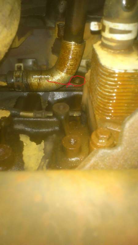 Při nastartovaným motoru to odkapává z té díry, nad ní je to suché.