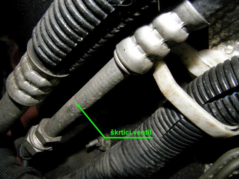 Škrtící ventil je taktéž na přepážce motorový prostor - přístrojová deska a vlastní ventil je uvnitř trubky vedoucí k výparníku a vypadá takto: