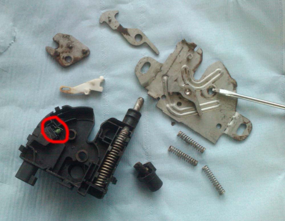 ... mam jiny problem se zamkem kapoty: prestalo v nem fungovat spinani pro alarm pri uzamceni. Vubec nevim, jak to vevnitr vypada a jak to spinani vlastne funguje - pres zamek nebo pres vystouplou pruzinu? ... z boku se dam da sice nahlednout, ale kdyz nevim co dal (a nyty se mi nicit nechce).