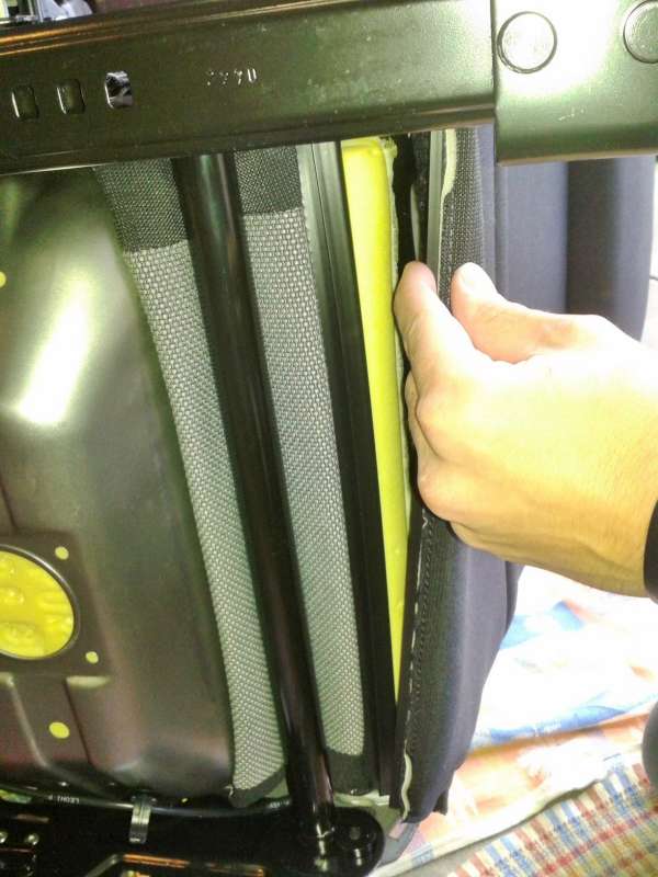 11) A jdeme na záda. Zezadu sedačky vycvakneme potah a podstrčíme jej pod sedákem (ruka zajíždějící pod sedadlo