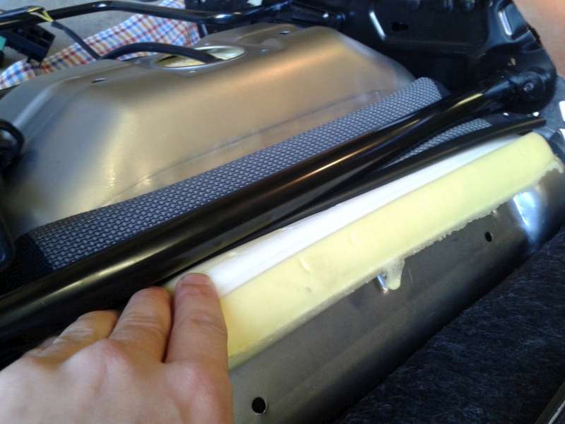Položíme na sedadlo dečku a pod sedákem prostrčíme kabely. Já zvolil největší otvor přímo pod sedákem (dají se jím prostrčit velké konektory). Červěně je zvýrazněný otvor.