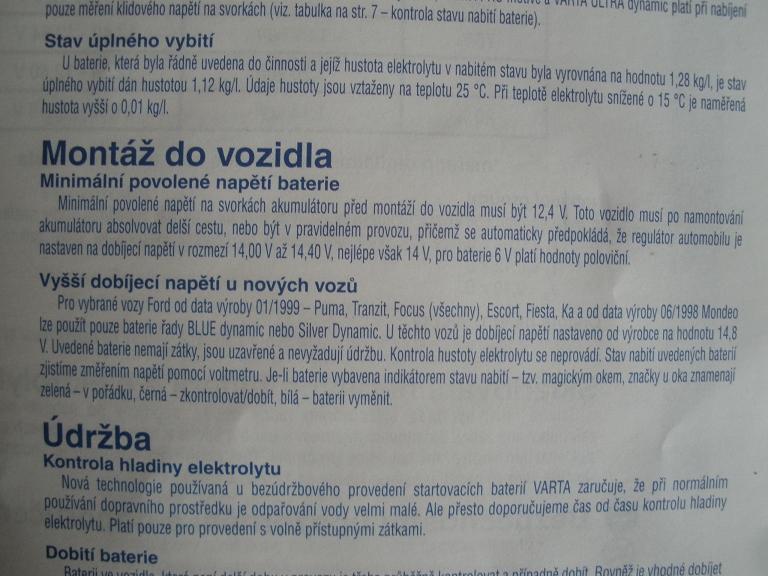 Před dvěma týdny jsem koupil Vartu sillver dynamic 12 V 77 Ah a v záručním listě se píše ,že vlastně do Forda nemůžeme dát jen tak nějakou baterii a to proto, že Ford má nastaveno vyšší dobíjecí napětí než jiná auta a baterie která na to vyšší dobíjení není přizpůsobená ,bude přebíjená a tím pádem nevydrží tolik ,kolik by měla.