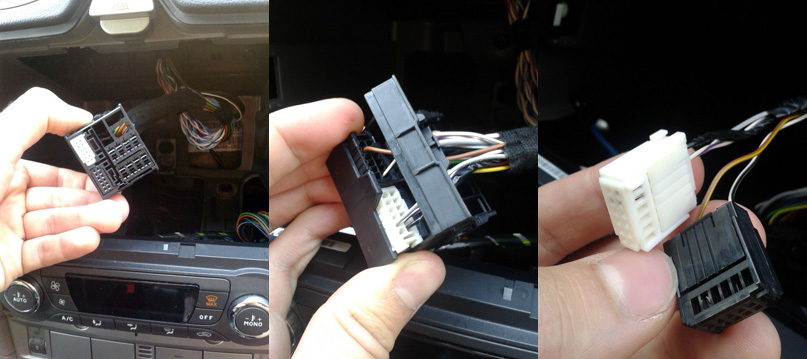 8 ) SOT-092 redukci propojíme s konektorem od autorádia, zapojíme do ní oba spodní konektory (které byly původně v originálním rádio konektoru). Kabeláž můžeme oblepit textilní izolační páskou pro zamezení otřesů.
