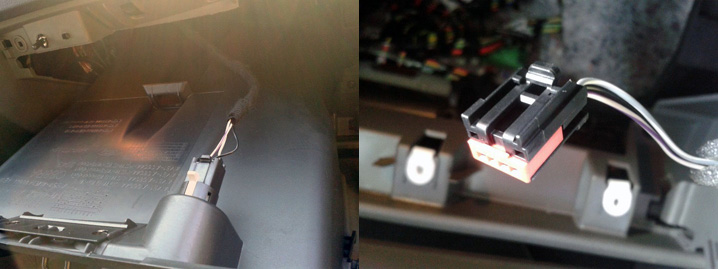 7) Konektor AUX který vede do přihrádky spolujezdce je také potřeba ustřihnout a připojit k BT modulu. (19, 37 a 38 na schématu)