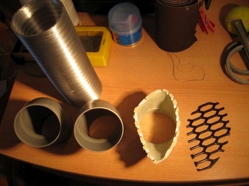 Kolínka který tvoří kříruby na filtrboxu i na nasávači jsou klasický novodurový kolena co používají instalatéři na odpady a to co bylo potřeba dotvarovat a vymodelovat jsem dělal z kitu, kde je to ve více vrstvách a mezi nimi vždy promotáno drátkem pro zpevnění celýho toho bazmeku.