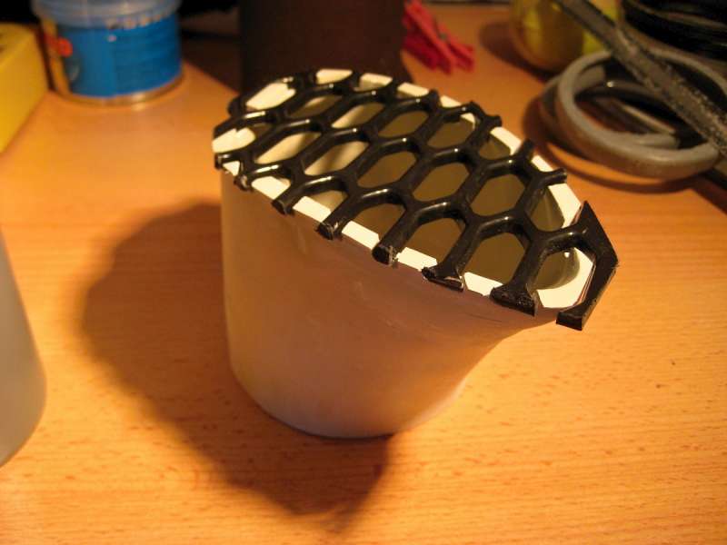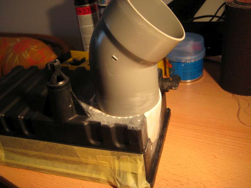 udělal jsem si "trychtýř" přesně na tvar a rozměr krajovýho nasávacího otvoru v RS paket nárazníku a aby to bylo připravený i na větší klapku, udělal jsem to celé v průměru 75mm. Na stejnej průměr jsem upravil i přívod do filtrboxu.