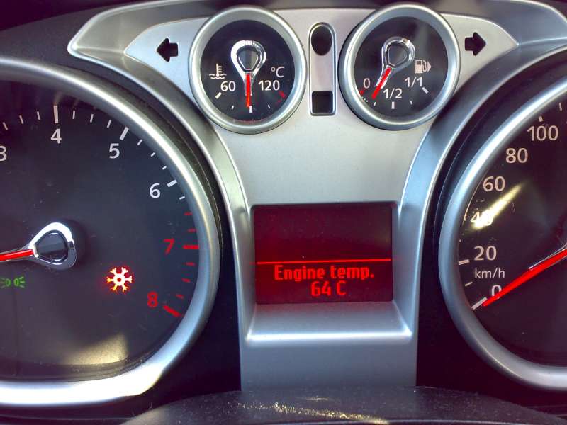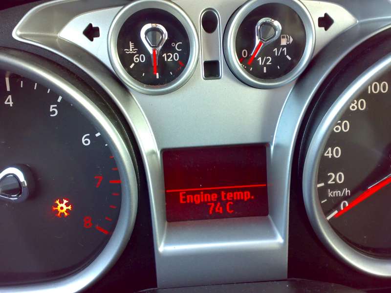 Co se týče ukazatele teploty tak se mi to chová úplně stejně. Nastartuju, ručička je na levém dorazu. Kousek popojedu (řekl bych že je to taky cca 500m) a ručička začne lézt nahoru a po několika sekundách je ručička uprostřed a tam je jako přilepená. Topit to začne až později a podle okamžité spotřeby to taky vypadá, že motor není zahřátý.