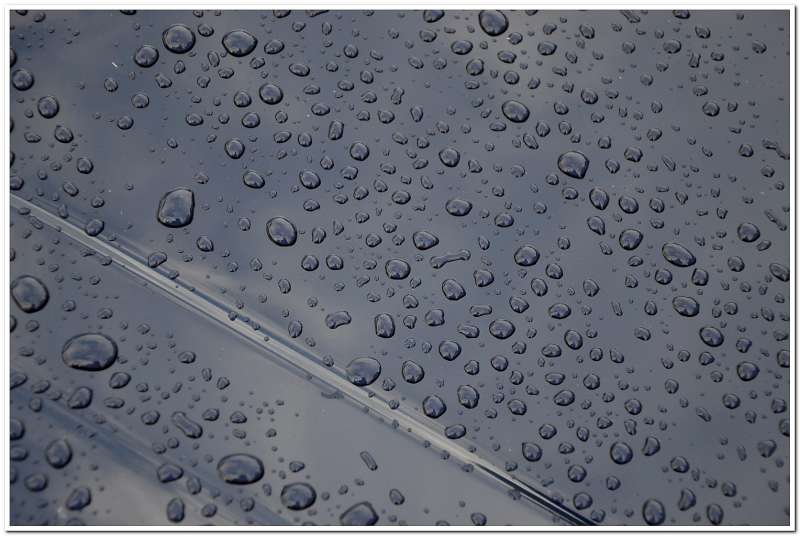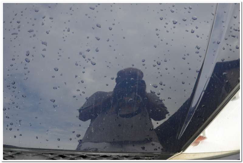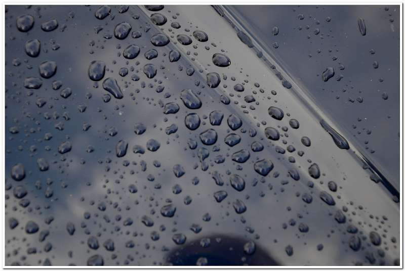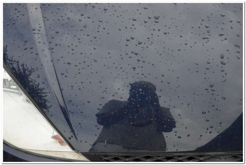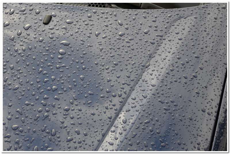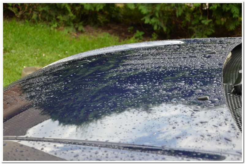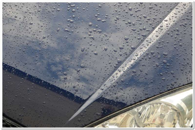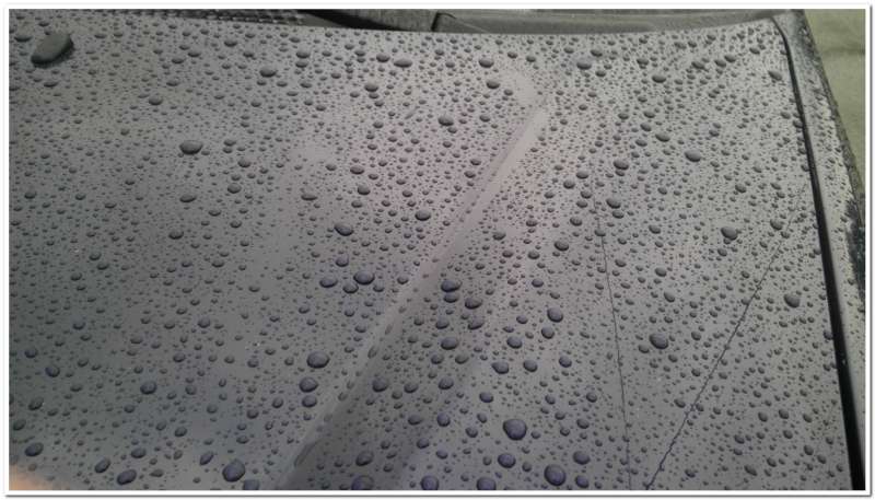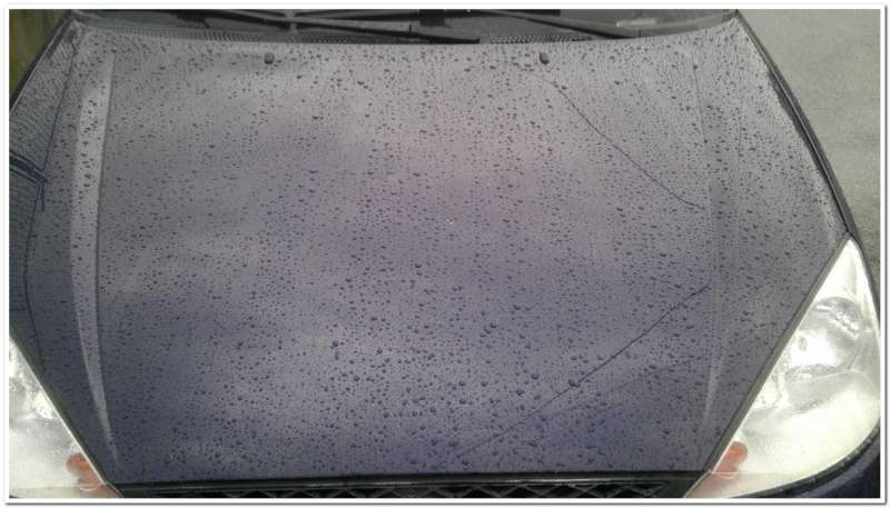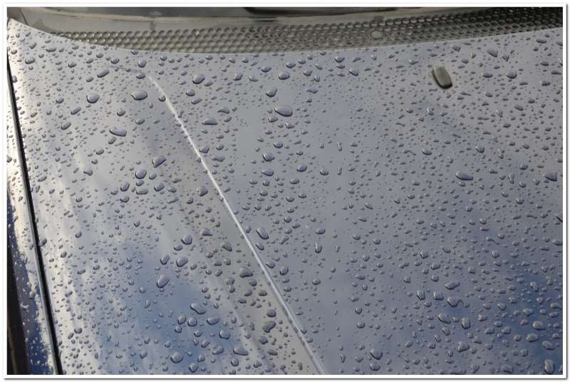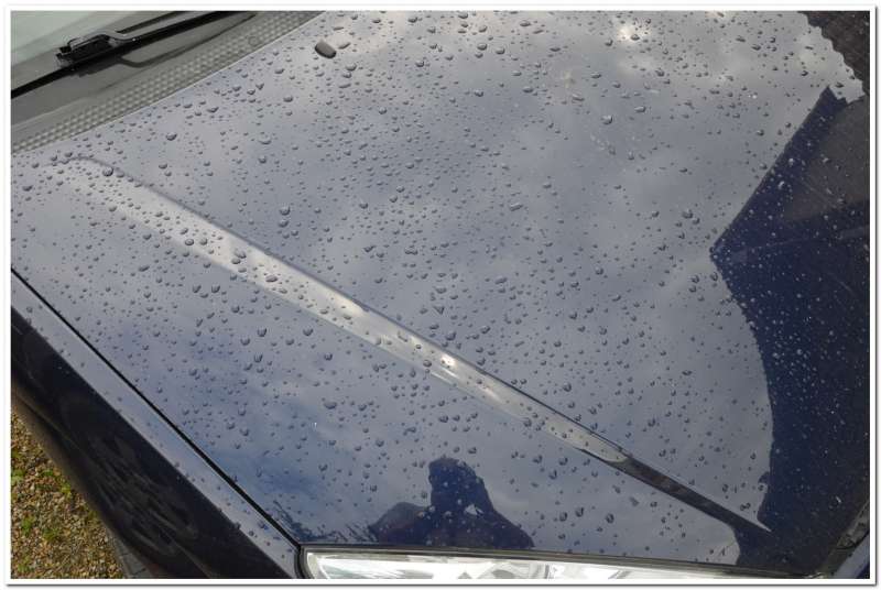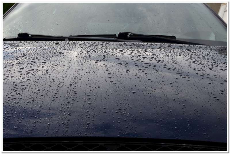 Auto zmoklo přes noc, ale během rána osychalo, takže vody na kapotě moc není, ale i tak lze pozorovat rozdíly oproti minulému srovnání. Především v koncetraci a množství vody, která se na autě udržela a ve tvaru vodních kapiček, které jsou ale na celé kapotě poškozeny z důvodu větších nečistot a zřejmě i větru...