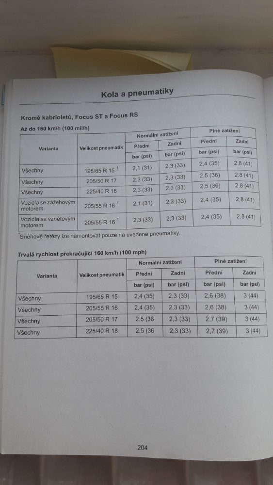 Máš pravdu, když pohledám tlaky v různých článcích na netu na příslušné auto a pneu, tak se to vše přiklání od 2,3-2,4 na PN a 2,3-24 na ZN. Až na ofiko Ford, kde je 2,1 a 2,3, což se mi zdá jako blbost. Určitě je motor těžší než prázdný kufr. Asi dám na většinu a to je 2,4 a 2,3. Souhlas?