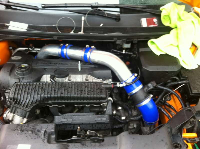 Musela by se nahradit i hadice jdoucí k turbodmychadlu kvůli průměru. Na obrázku použita originální ale je vidět, že v místě spojení je AL trubka upravena na menší průměr.
