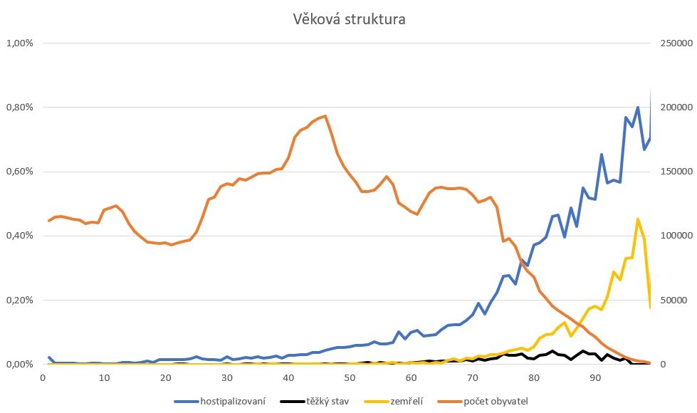 oranzova je vekova struktura obyvatelstva CR (hodnoty na prave ose Y), ostatni je procentualni pocet obyvatel daneho veku v nemocnici / v tezkem stavu / zemreli ... vse vyscitano od brezna ... schvalne to konci ve veku 99 let, protoze stat vse nad 100 let vyscitava do jedne hodnoty
