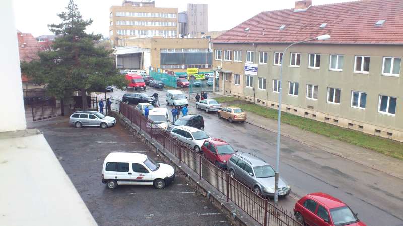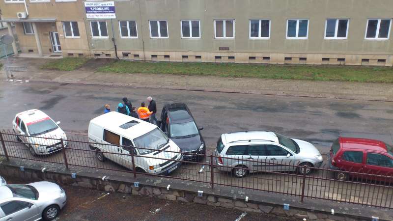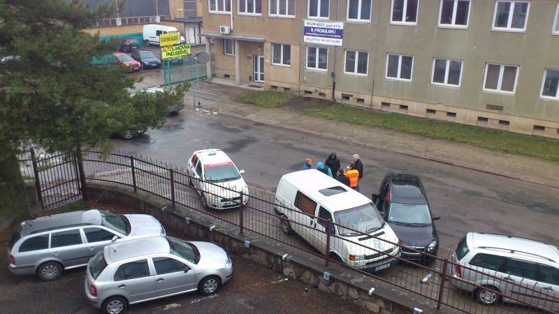 A dnes mě od oběda v práci vyruší toto... Mondeo asi nedalo přednost Růmstru a ten to následně napral do Transportera (kolega z práce) a Focusu (nevím čí, ale parkuje tu často)..