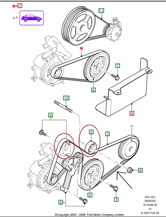 Jo, jo, taky mám vyměněn komplet pohon příslušenství - řemenici, napínací kladku, řemen a obě vodící kladky. Dělal jsem podle TSI 18/2005, ale stejně je to dle mého názoru konstrukční chyba od Ford. V Transitu je stejnej motor a nedělá to! Proto jsem taky nejdřív zkoušel řemen z Transitu, který je kratší - myslím 6PK1936 (u Mondeo byl 1640). Podle poslední TSI by tam měl být (v Mondeo MkIII) ten z Transitu. Zatím je to OK, ale pokud se to objeví znovu, tak přemýšlím ještě o dobastlení jedné vodídí kladky mezi řemenici a klimu, tak aby tlačila řemen nahoru a tím jej napínala - viz. obrázek. Iggyrock