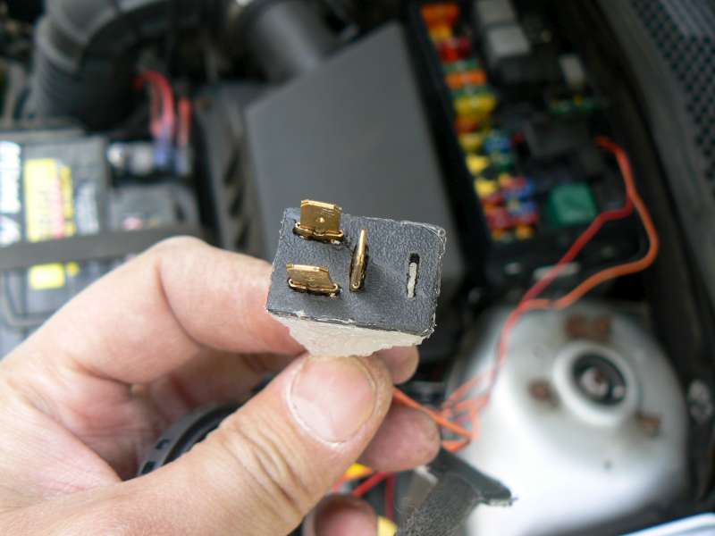 - vše zapojeno v patici pro relé denního svícení, jen ten "konektor" se musí ještě doplnit (došli náboje v tavné pistoli) a stříknout na černo
