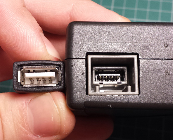 2) 1x konektor USB samice (ten co je třeba v PC). Z tohoto konektoru odendáme plechovou část. Takto upravený konektor již jde zastrčit do BT modulu. Možná bude potřeba více napružit kontakty na konektoru.