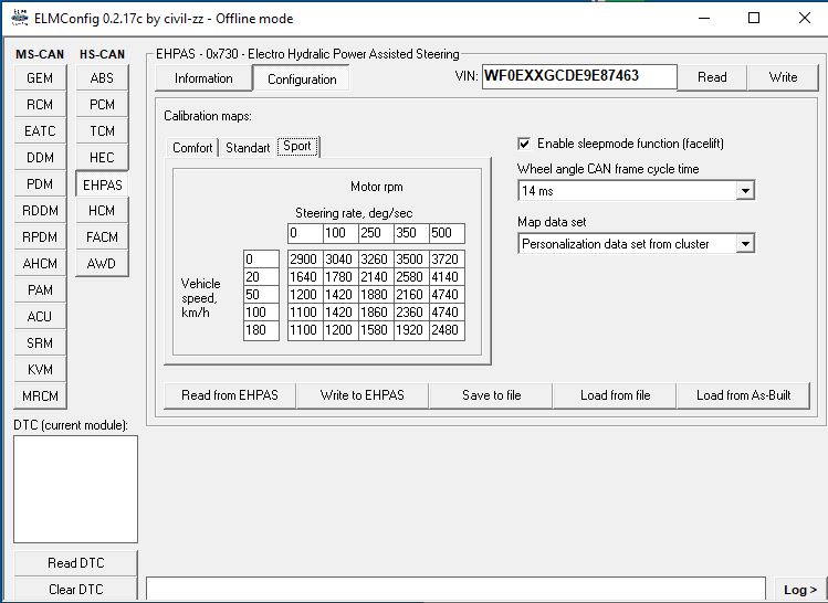 Přes ELM Config lze všechny režiny upravit, je to karta Configuration v nabídce EHPAS. Níže příklad nastavení našeho auta: