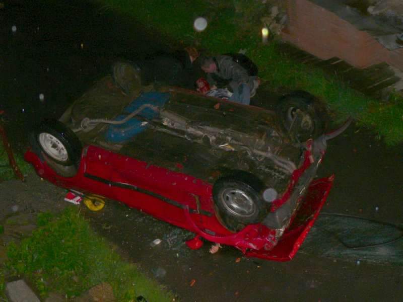 Jednou jsem byl svědkem ošklivé autonehody. Bylo to při rally Český Krumlov, spali jsme v obci Křemže. Večer jsme šli do místní restaurace takovou slepou ulicí která končila vysokým obrubníkem, trávníkem, kovovým zábradlým, 2,5m hlubokým příkopem kde byl chodník a silnice a na druhé straně baráky. Najednou šílenej hukot, sotva jsme se stačily rozutéct a kolem nás se prohnal šílenec s autem. Pak následoval náraz na obrubník a dlouhý let za zvuku vytočeného motoru, ten magor ani neubral. Let zakončil náraz na střechu protilehlého domu za ohromné rány bortících se plechů se auto sesunulo na zem střechou dolů. Nedovede si představit ten pocit když se nám tohle odehrávalo před očima. Běželi jsme k tomu zábradlí a uviděli jsme tu zkázu. Někteří z nás hned seskočily dolů. Já až po chvilce. Vyndali jsme z auta pěkně pomláceného řidiče a dávali mu první pomoc, pěkně z něj táhl chlast. Po chvilce řekl že je v autě kamarád. Toho byla velká práce dostat ven, byl skřípnutej pod palubkou a ruka mu koukala ven. Pěknej hnus. Docela dlouho jsme čekali na nějakou pomoc. Nejdříve přijeli hasiči, ale zřejmně je to hodně sebralo a nebyli schopni nám pomoci. Z toho druhého při snaze mu dát masáž srdce mu z úst vytékala krev. Zřejmně velké vnitřní zranění. Když přijela záchranka tak jsme odešli a už jsme neměli ani chuť jít do hospody. Pěkně hnusnej zážitek.