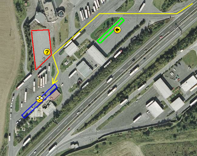 Hm, tak to nejsou dobré zprávy. Modrá plocha tím nepřichází v úvahu, červená bude také riskantní (je na dohled od kamionů a relativně v ústraní), takže zbývají jen ty stojany. Před nimi je spousta místa. Dalo by se tam zastavit na zelené ploše? Není tam nějaký zákaz? Za chvíli mi dojdou barvičky...