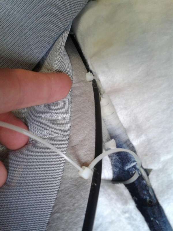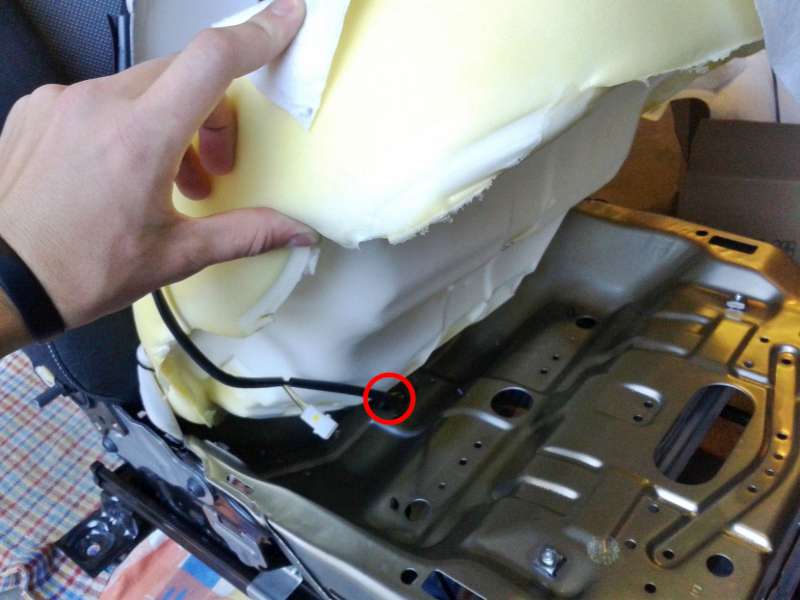Položíme na sedadlo dečku a pod sedákem prostrčíme kabely. Já zvolil největší otvor přímo pod sedákem (dají se jím prostrčit velké konektory). Červěně je zvýrazněný otvor.