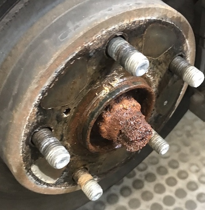 Jak tedy chránit štefty a střed kotouče proti korozi zvláště v zimě ? Zrovna šteft v tahu jen tak nepraskne,v drtivé většině případů se ukroutí při povolování zarezlé matice. Při stoupání závitu 1,5 nebo 1,25 je matice podstatně odolnější na samovolné povolení než u klasického stoupání a když zaroste,tak právě díky jemnému závitu se s toho stává prakticky nerozebiratelný spoj a nepomůže ani chemický klíč.Ještě možná autogen,ale v tom případě a musí postižené štefty vyměnit.Původní povrchová úprava šteftů vezme za své již po několika zásahy drátěného kartáče a pak už jen rezne.I tohle umí jedna zimní sezóna.