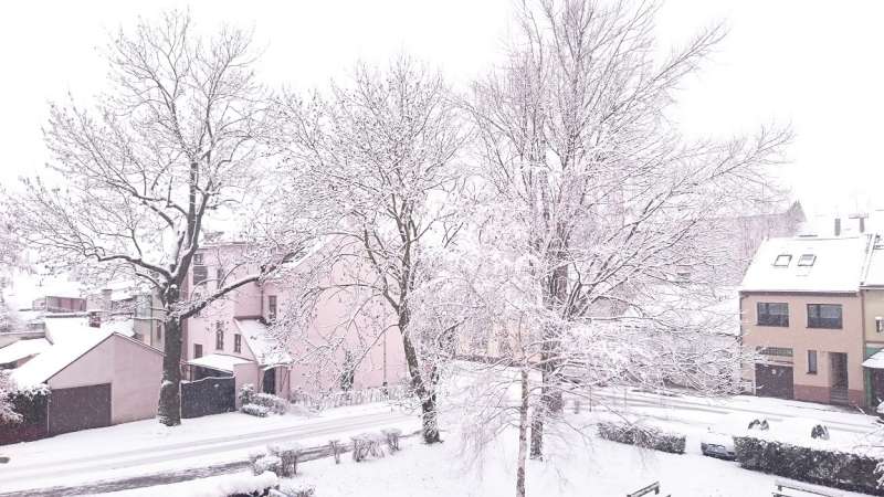 dnešní ráno v Přerově, 0 °C a sněží, teď je aktuálně +1 °C