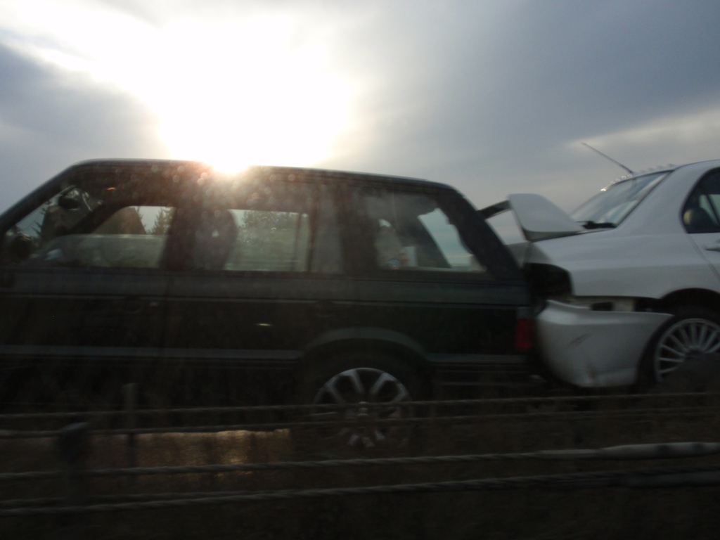 Tohle jsem vyfotil dnes na R7, tam jak je na úrovni letiště ten debilní přechod pro chodce. Range vezl Micinu na vleku, evidentně jí neměl dobře zajištěnou, z nějakého důvodu musel ostře brzdit a Micina mu vlítla do kufru. Výsledkem jsou dost rozbité zadky obou aut, včetně vyskleného zadního skla Range, ten ale zepředu nabouraný nebyl. Musím přinat, že jsem ani nemyslel, že se mi to za jízdy vůbec podaří vyfotit - jel jsem v opačném směru...