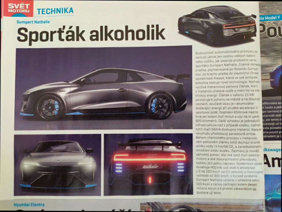 Nathalie je totiž elektromobil, ale ne dobíjený z běžné elektrické sítě. Netankuje ani vodík, který je podle mnohých budoucností motorismu. Nathalie totiž do nádrží nabere metanol, tedy čistý alkohol.