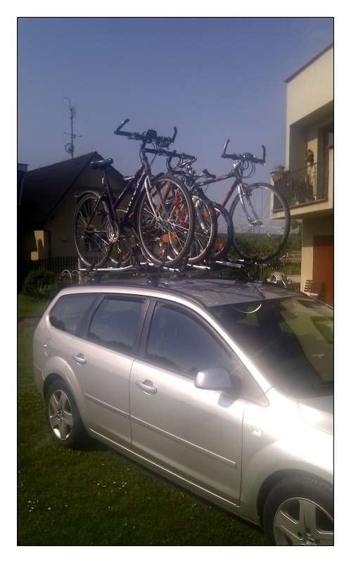 Tak čtyři nosiče jsme na střechu dostali v pohodě, stejně jako čtyři kola - dvě dospělá jedno tříčtvrteční a jedno dětské. Nebude problém tam dostat 4 dospělé, hlavně díky tomu, že jednotlivé nosiče lze posunout více dopředu nebo dozadu, takže řídítka budou ne vedle sebe, ale za sebou.