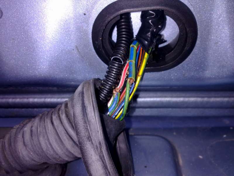 Je to přerušený zelený kabel ve svazku v horní průchodce zadních dveří.