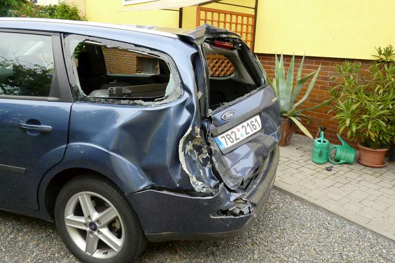 Zničena zadní část vozu, zvlněná střecha, skřížená karoserie