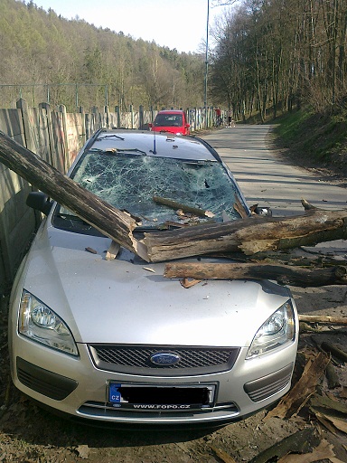 kamarádce, když jsme hráli na zámku v Litomyšli, spadnul strom v parku na Peugeota. Byla tehdy (asi dva roky zpátky) ta hrozná vichřice. Měla to tedy pojištěný a myslím, že jí to všechno zaplatili. Ona ale měla to auto míň poškozený, vzala jí "jenom" hodně velká větev, takže čelní sklo, promáčklá kapota, ale motor nedotčen.