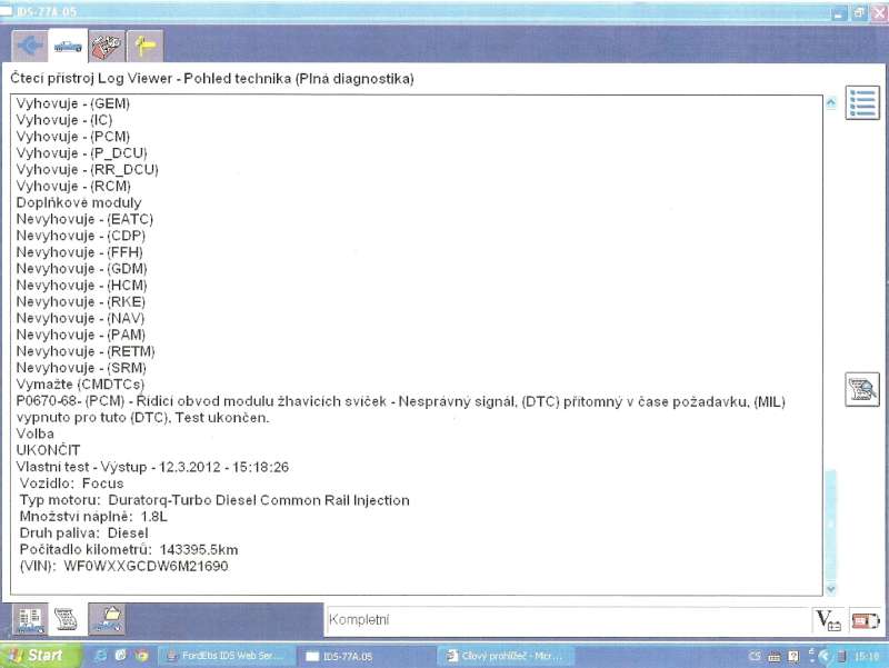 Mám mít údajně elektrický problém v kabeláži (Focus Combi r.v. 2006, 1.8TDCI, 85kw). Palubní počítač mi vyhazuje chybovou červenou hlášku "Engine system fault" . Diagnostika provedena 5x u nezavislych opravaru (z toho i u autorizovaneho servisu Ford viz priloha. bud nenalezena zadna chyba, nebo nalezena pouze chyba zhaveni a elektricky okruh. zhaveni odstraneno, na kabelazi par chyb odstraneno ale stale nedokonceno..)
