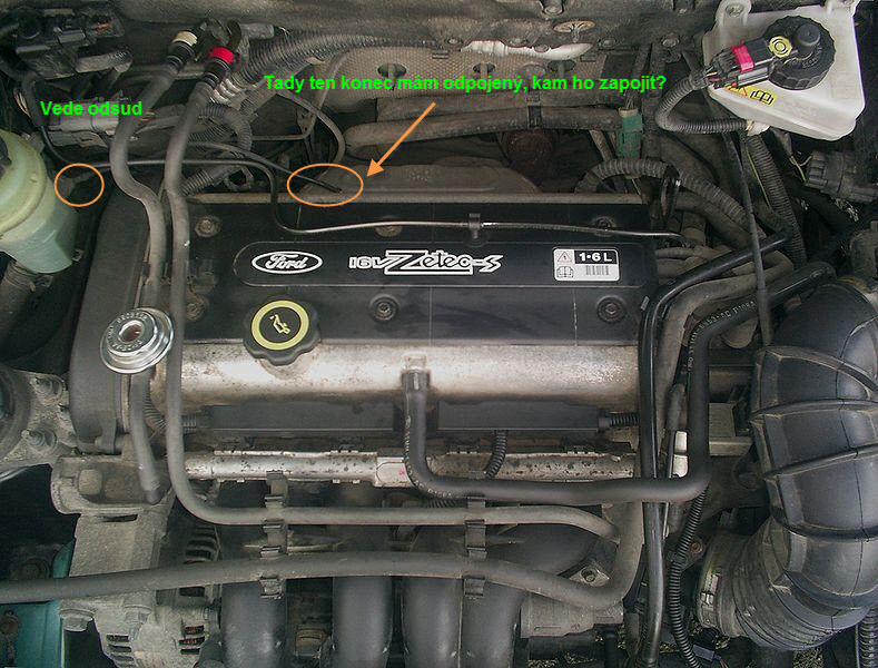 Je to ukostření hlavy motoru.Jedno nalisované očko je přikroucené ke karoserii u tlumiče.Druhé očko( to Ti upadlo) drží šroubek v hranatém nálitku zezadu na hlavě.Zhruba v úrovni línie 2 svíčky.Když se nahneš přez motor,tak tam pod tím šroubkem to očko určitě bude.