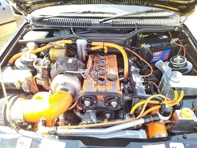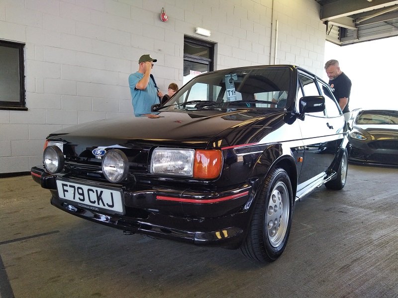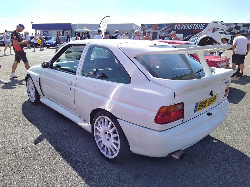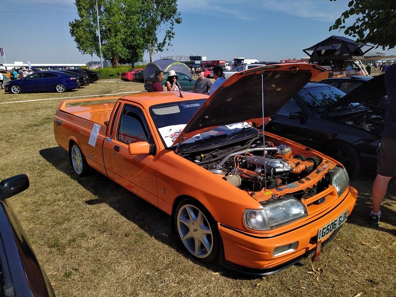 Jízdy pokračovaly během celého dne, takže jsme šli dál po okruhu sledovat, co vše ještě můžeme vidět. Za zmínku stojí určitě stánek hlavního sponzora Mountune. Stály se tam velké fronty v turniketech na prodej dílů - a že to tam chvíli vypadalo, jako kdyby ty věci dávali zadarmo. Za menším hloučkem lidí - závodní verze Ford RS200. Jdeme dále - nacházíme místo se stánky s občerstvením a autokosmetikou. Před ním stojí stará hranatá Fiesta - s motorem YB Cosworth a Turbem T04, přestavěnou na zadní náhon. Majitel patrně šílenec. Asi po další půlhodině procházení mezi zajímavými kousky, které byly různě zatoulané - jako třeba pár Focusů RS MK1, které nestály u hlavního dvojřadu. Co jsme tak pochopili, tak jsou určité zóny, kde jsou určitá auta pospolu a pak ještě zóny, kde jsou kluby. Takže proto se kolikrát objevily auta různě rozházená. Ale bylo to svým způsobem takové pestřejší a vlastně dopředu nikdo nevěděl, co tam bude stát. Po chvíli vidím první Sierru RS Cosworth v bílé barvě a 3dveř s ploutví. Není to RS500, ale první civilní třídveř. Vedle něj Saphire RS Cosworth. Oba kousky přepečlivě umyty a naleštěny. Kousek od těchto krásných kousků procházíme místem, kde byla burza s díly, stánky s různým oblečením, nálepkami, kosmetikou, díly, modely autíček až po občerstvení. Na chvíli odběhnul Mates - ikdyž tam nebylo tak přelidněno jak jsem čekal, během pár vteřin byl pryč. Za chvíli se objevil, drapnul mě a že se asi poseru! - No skoro ano, Ford Capri, ale překopaný dobovým týmem DRM (předchůdci DTM) Zakspeed. Takže na place stál Ford Capri Zakspeed Turbo. Upřímně bych tohle čekal spíše mimo Anglii, ale tohle mě dostalo! Byly dvě varianty motorů - 1,4 Turbo 480koní 9200 ot/min a 1,7 Turbo něco přes 600koní a stejně točící se nesmysl...Přiznám se, že nevím která jednotka v tom byla, ale bylo to šílené, vidět to na vlastní oči a z blízka. Auto z trubek o váze kolem 800kg s takovým výkonem. Masivní bodykit a pod dlouhou kapotou malý brutální mixér, který ve své době neměl konkurenci. Takže zase zpět nohama na zem a jde se dál. O kousek dál nám zase předvedli angličani zlaté ruce a lidovou tvořivost. Focus RS MK2 Cabriolet... To už se po sobě díváme, jestli nemáme úpal, ale tam to asi krom nás 4 nikoho ze židle nezvedalo. Pomalu jsme dostávali hlad, takže jsme se odebrali směrem ke stánku. Po cestě nacházím první Sierru RS500 Cosworth v originál verzi, ale místo T04 bylo turbo Borg Warner. Přicházíme ke stánkům na anglický cheesburger, který byl snad asi nejlepší, jaký jsem kdy jedl, až na uřvanou prodávající, která byla jako papoušek a v okruhu stánků jsme slyšeli jen ji a její " Next please! " . Nicméně sedímena u stolu a díváme se na Mustang Shelby GT500 Eleanor...Po jídle jsme pokračovali v procházce dále. Na jednom place bylo asi 20kousků Fiesty ST200 v šedé barvě. Po cestě vidíme palouk, kde z dálky září oranžová asi 80ks ST Focusů MK2 a MK3, nacházíme Escorty, Mondea, Escorty ve verzi kurýr, Sierru pickup. Mondea ST220....bylo toho tolik, že se to nedalo ani všechno zapamatovat a fotit.