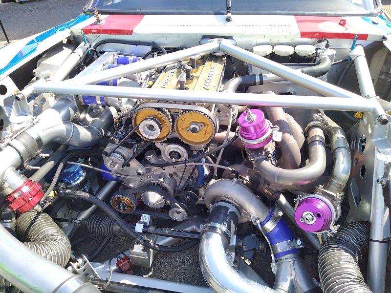 Pořád mě to ale táhlo opětovně do depa. Po cestě do depa vidíme stát bílý Escort RS Cosworth a červený Escort RS Cosworth upravovaný od italského specialistu na Cosworthy Oppligera s hodně velkým turbem Borg Warner. Dále na place stojí ona známá placka, bestie skupiny B. Ford RS200 - kdo by byl překvapen, samozřejmě na značkách. Také jsme našli místní zběsilý Focus Mk1 Combi od Howea. Překopaný na 1,6 EcoBoost z Fiesty. Auto hodně zajimavé z blízka a hodně fungující na trati. Teda, když zrovna jede, protože chudáka Howea dotáhli před depo po tom, co totálně rozthal přední slick. Takže se vyměnilo kolo a pokračoval v další jízdě. Na place jsme viděli další zajímavý projekt. Focus MK1 ST170 - přestavěný bodykitem na RS. Motor 4,0 V8 Toyota/Lexus, dvě turba Td04 z Volva S60, převodovka z BMW a zadní náprava z Nissanu 350z s diferenciálem s omezeným prokluzem. Výfuky v prahu před zadním kolem a to vše v červené barvě, a ano, na značkách.