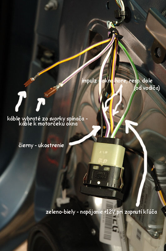- zeleny kabel (na EW310 - podla obrazku) spojte s tenkym fialovom-zltym (od motora okna)