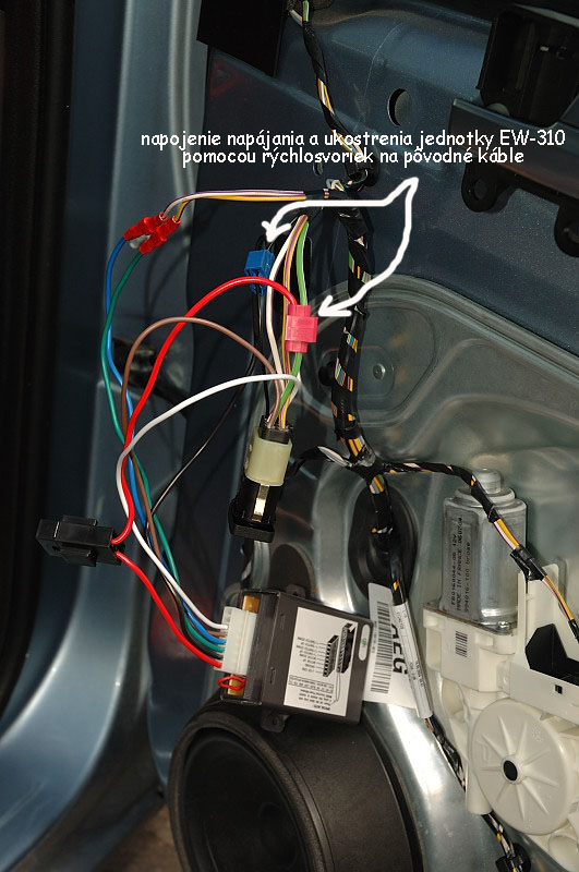 - modry kabel (na EW310 - podla obrazku) spojite pomocou "dutinky", alebo "cokolady" s tenkym fialovo-bielym (od motora okna)